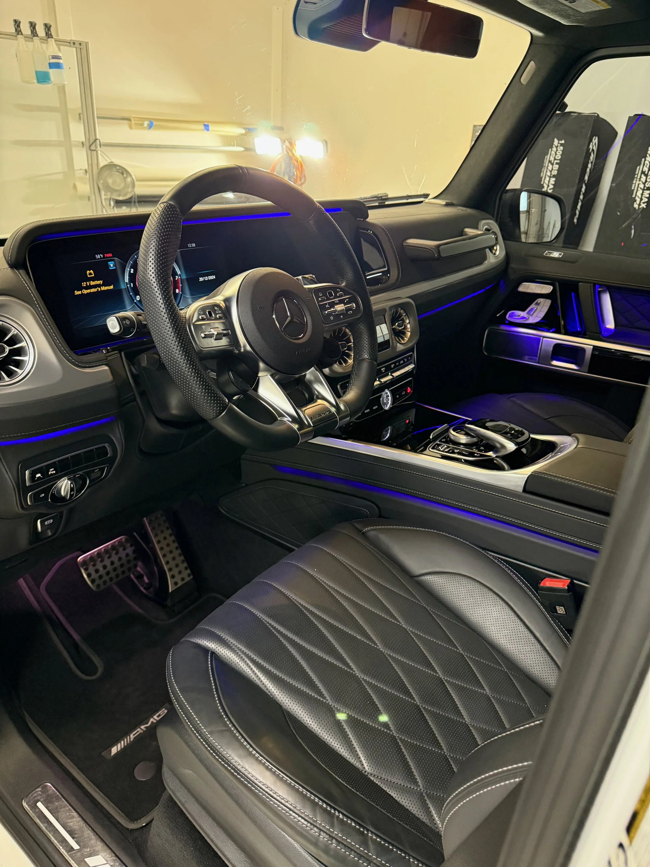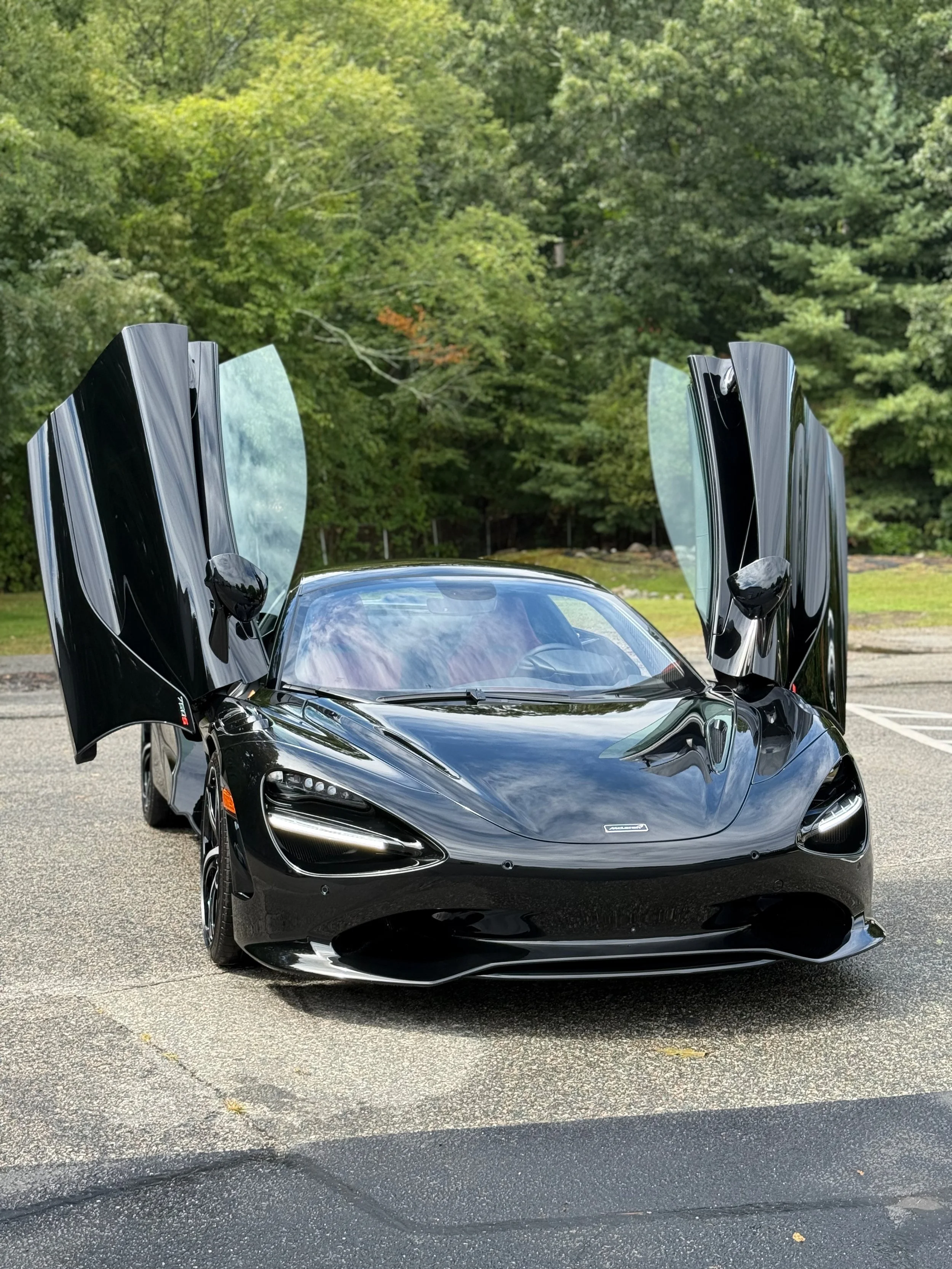 Black Mercedes-Benz car parked on a driveway in front of a beige house with autumn trees in the background.