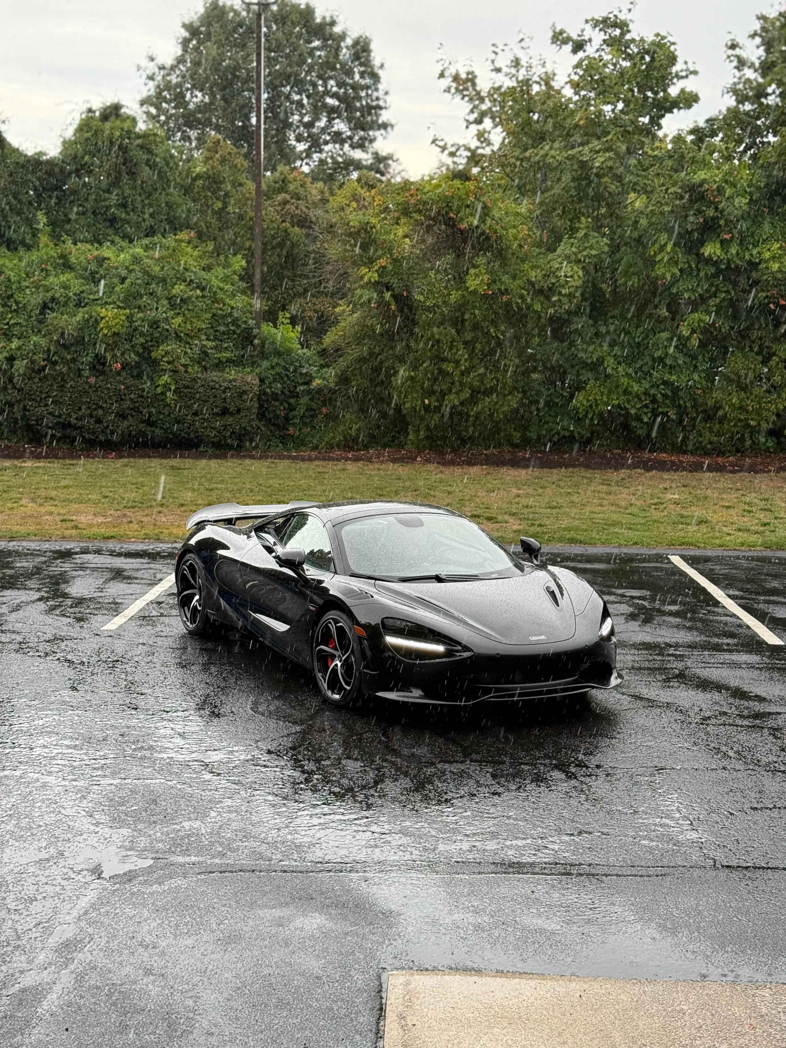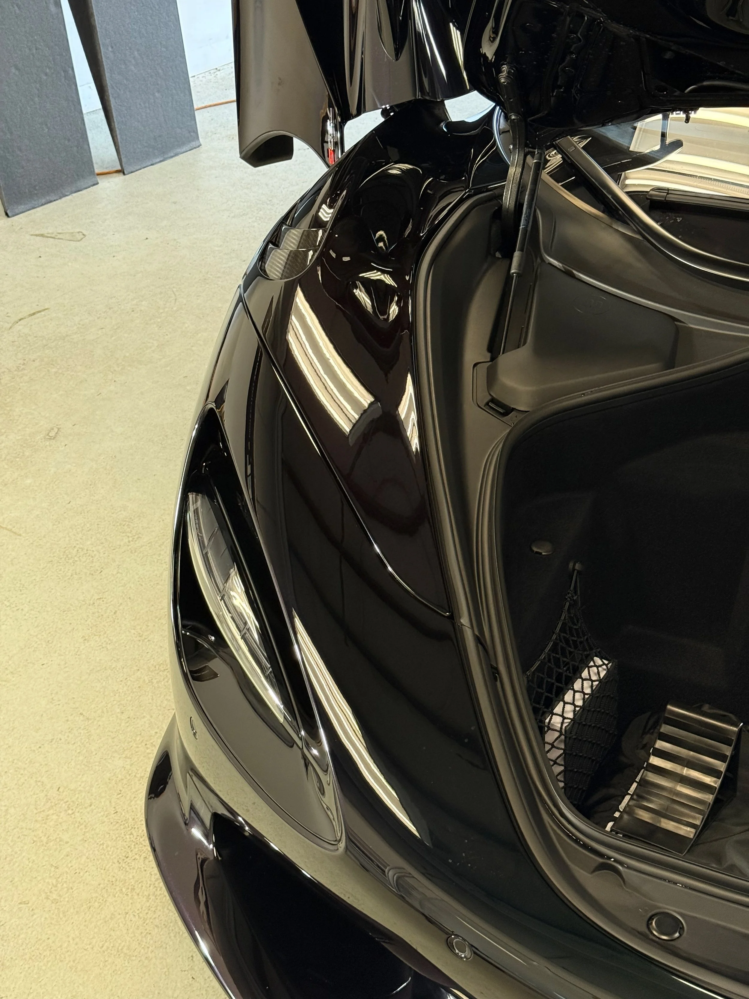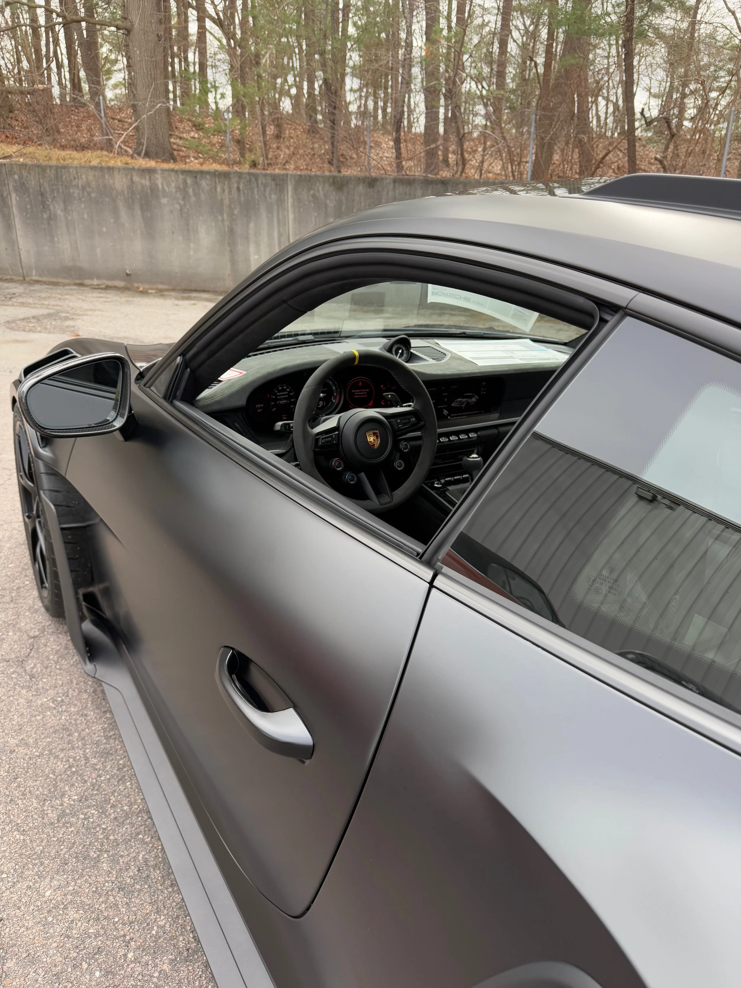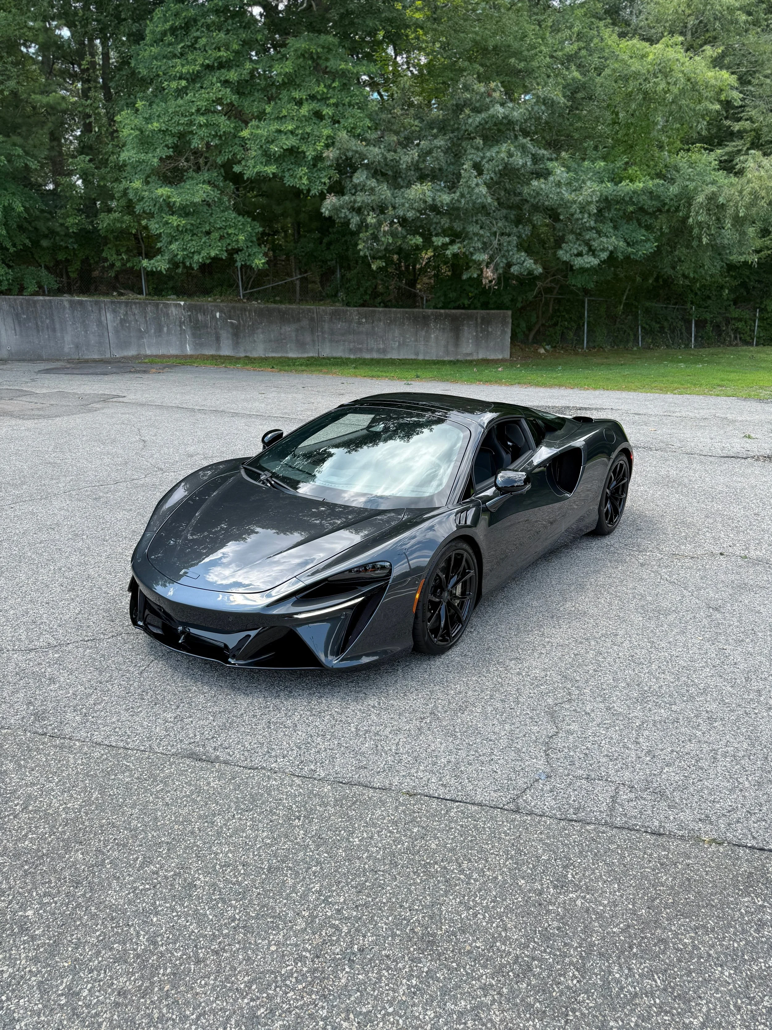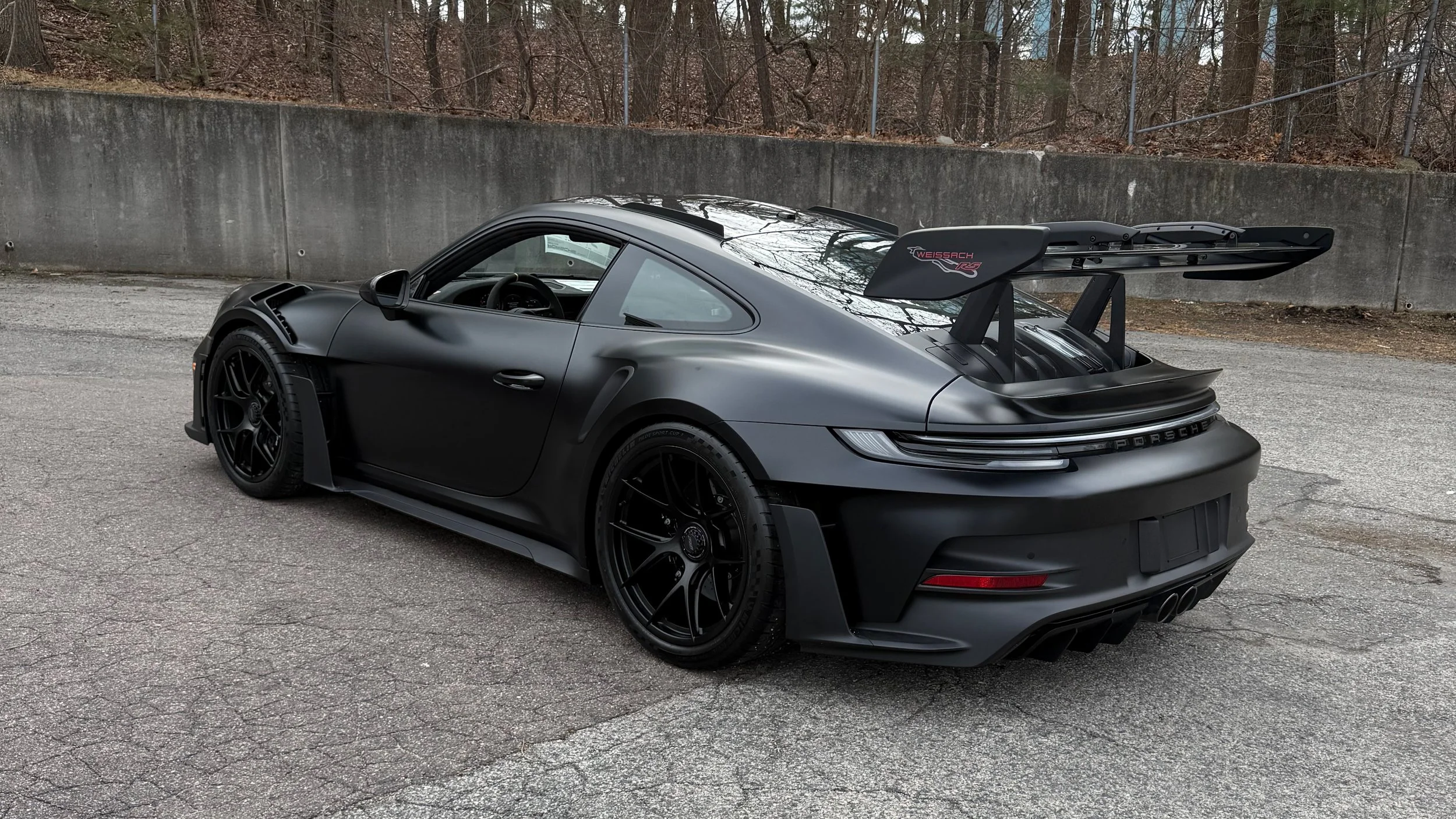 Black convertible car parked in a driveway, with a matte finish and open roof, surrounded by residential and commercial buildings.