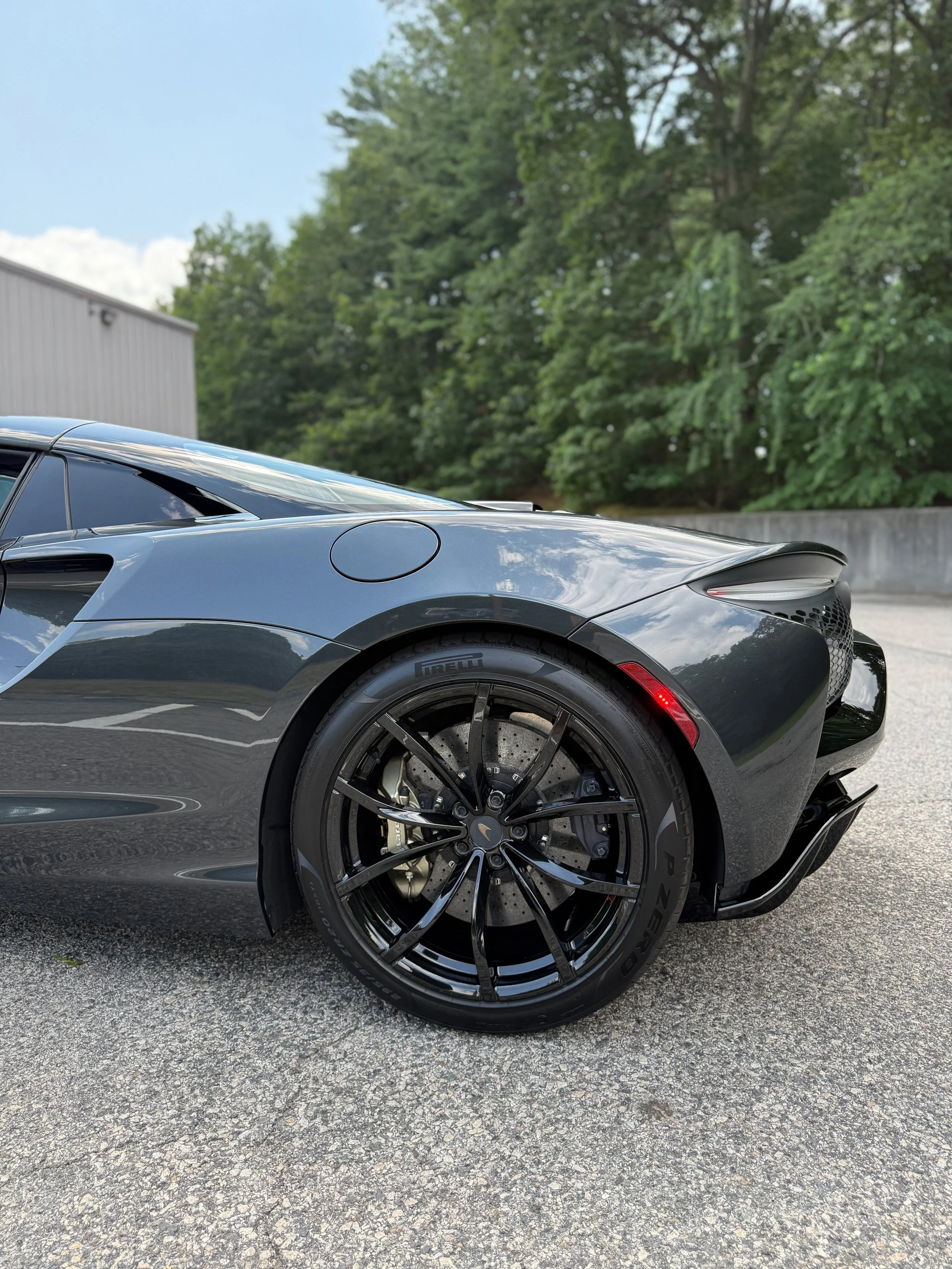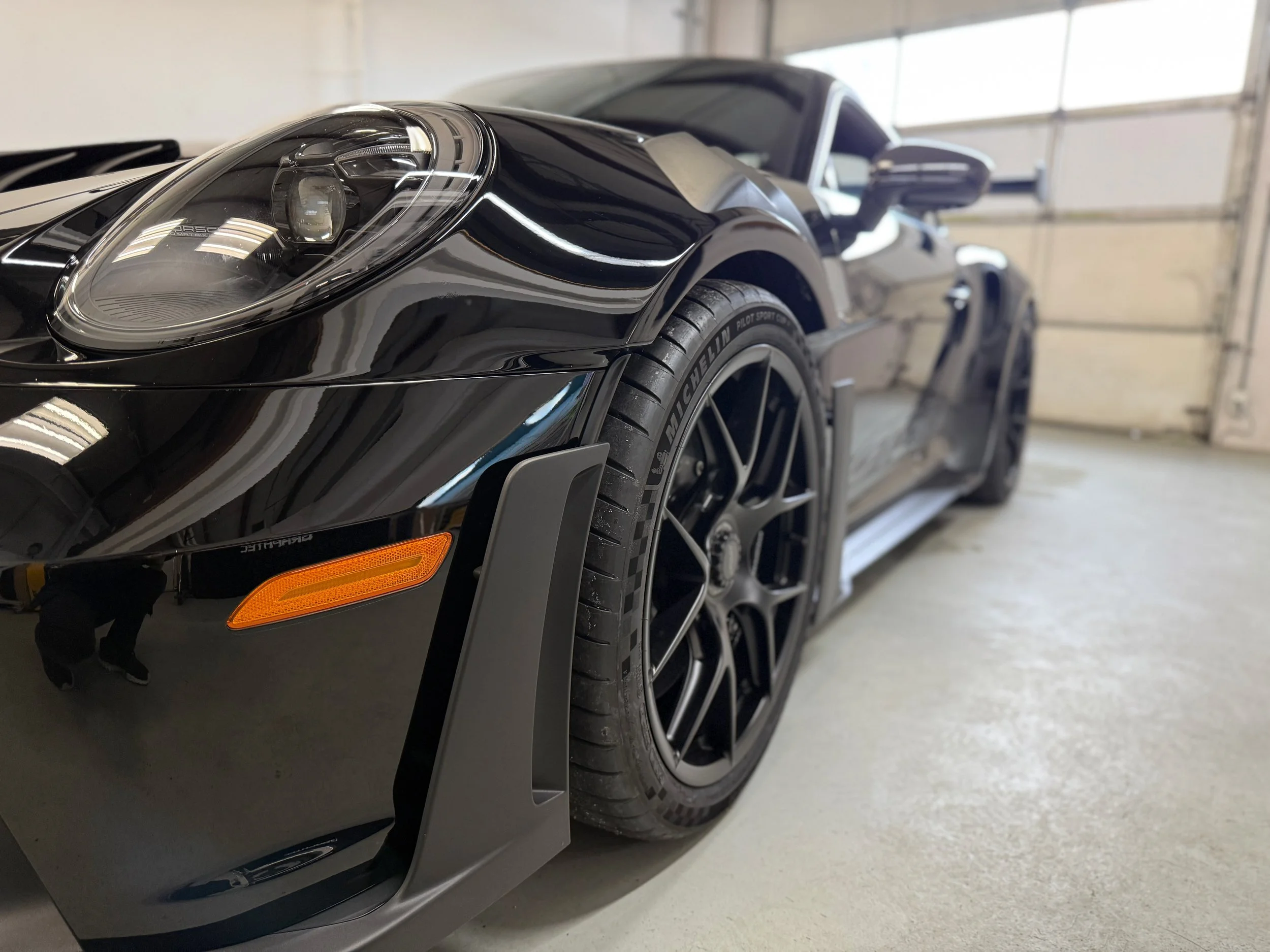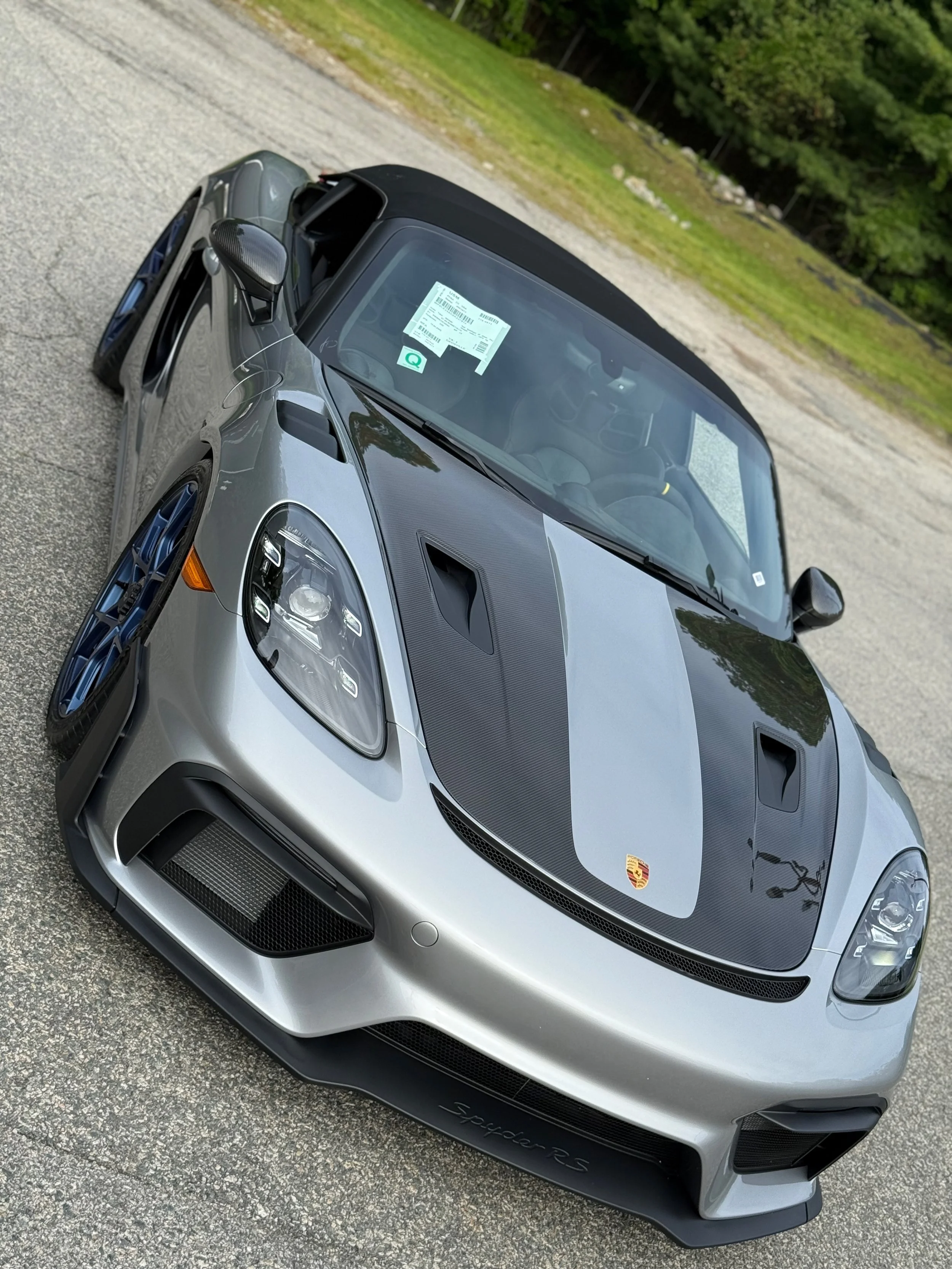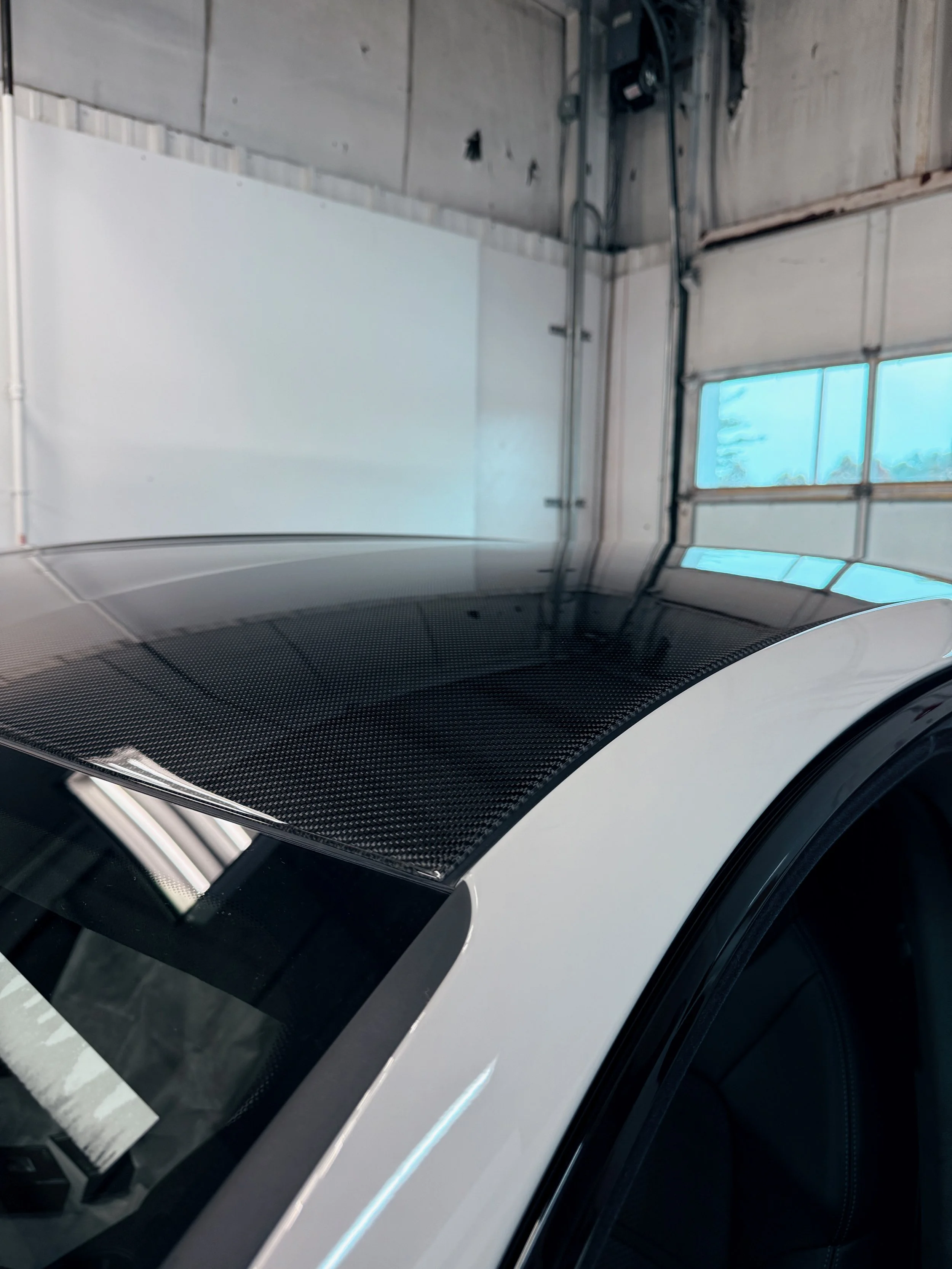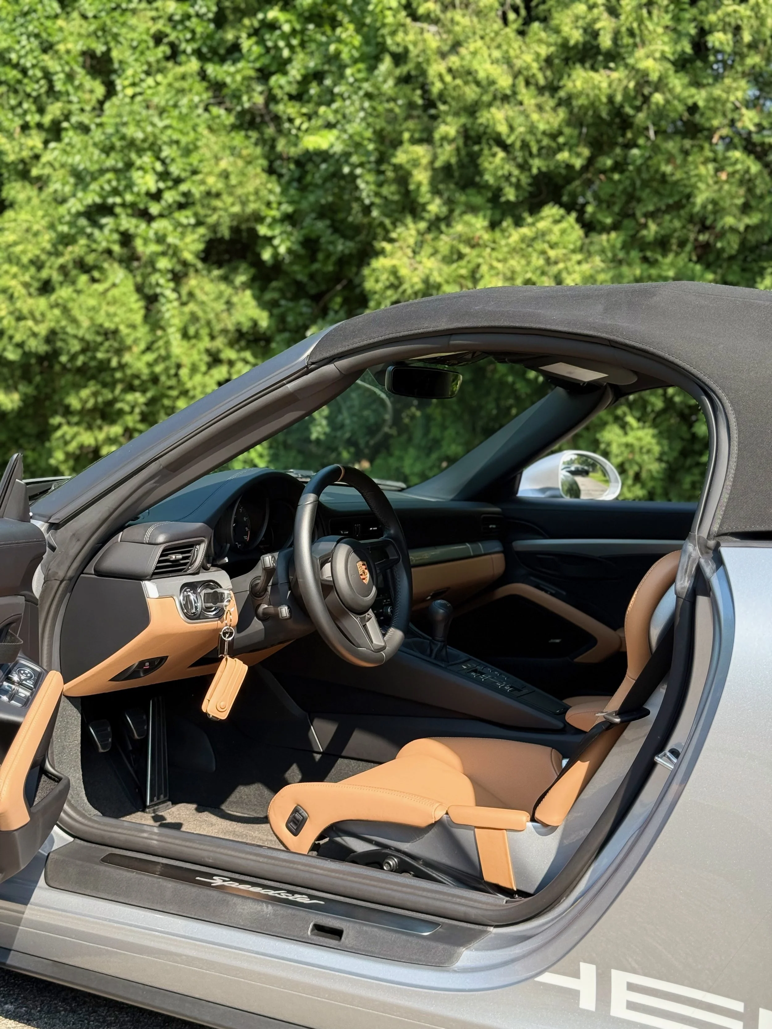 Black convertible car parked in a driveway, with a matte finish and open roof, surrounded by residential and commercial buildings.