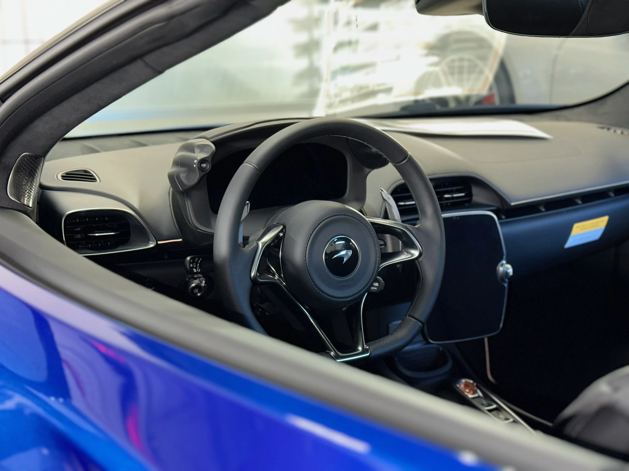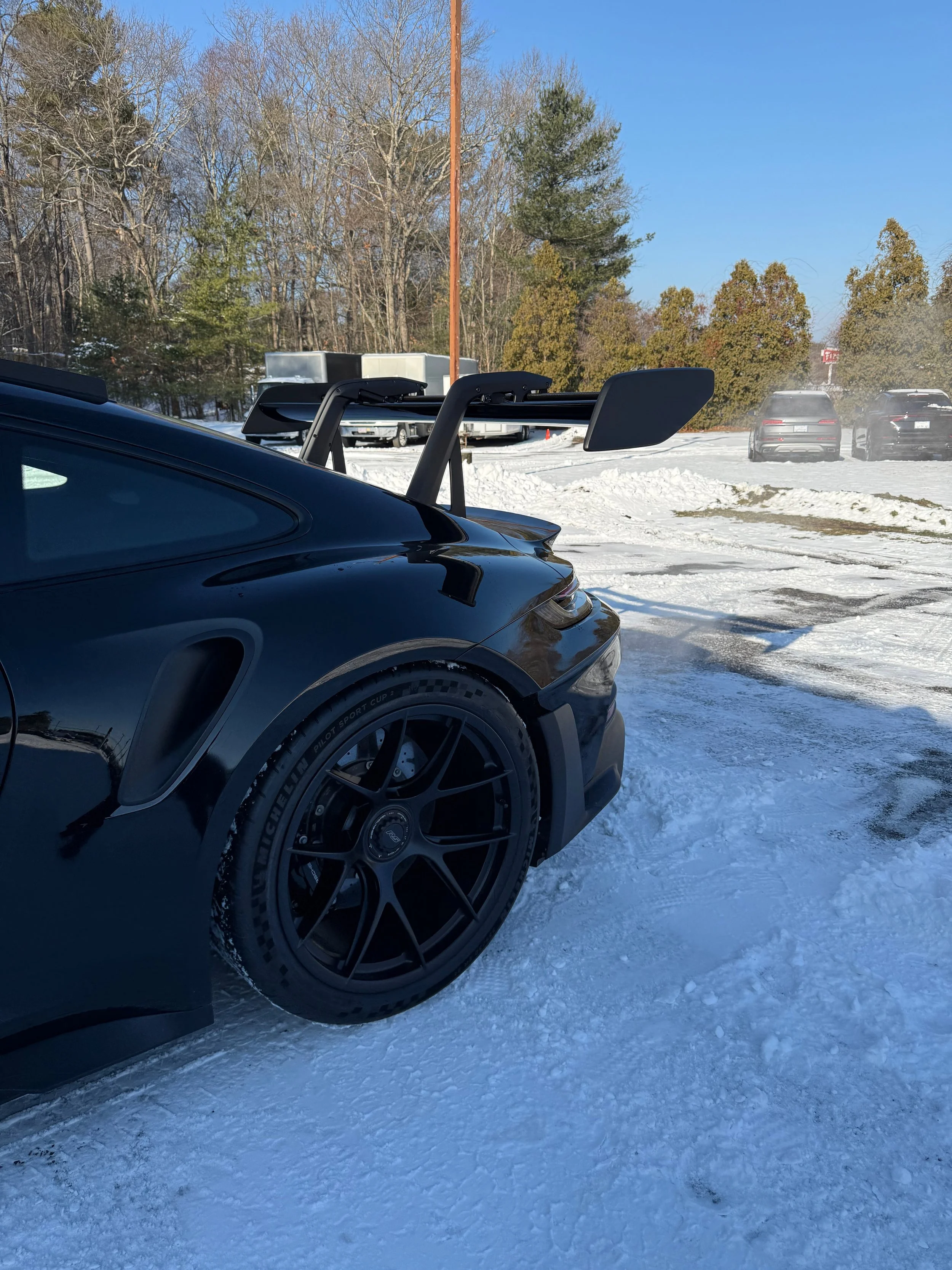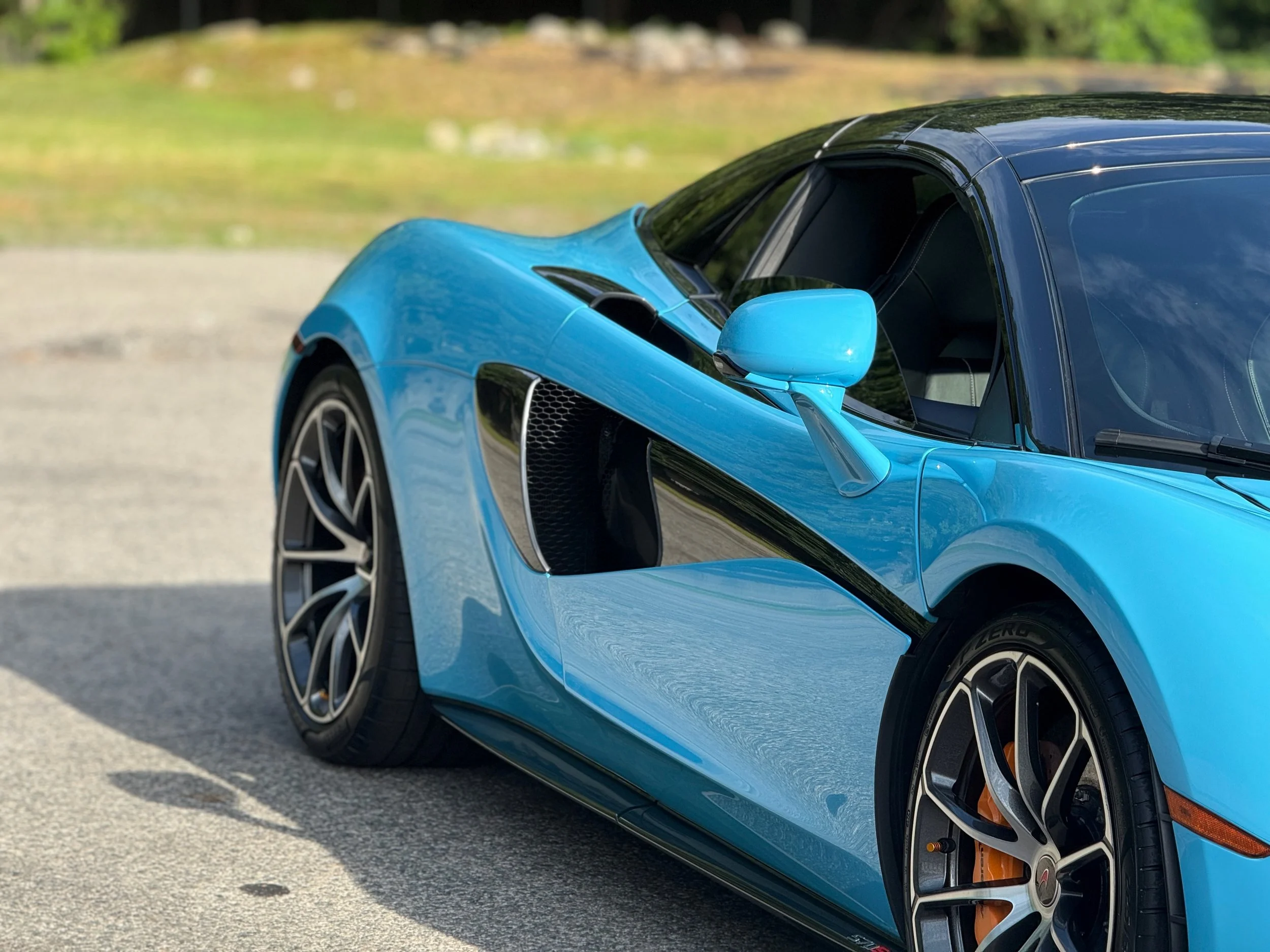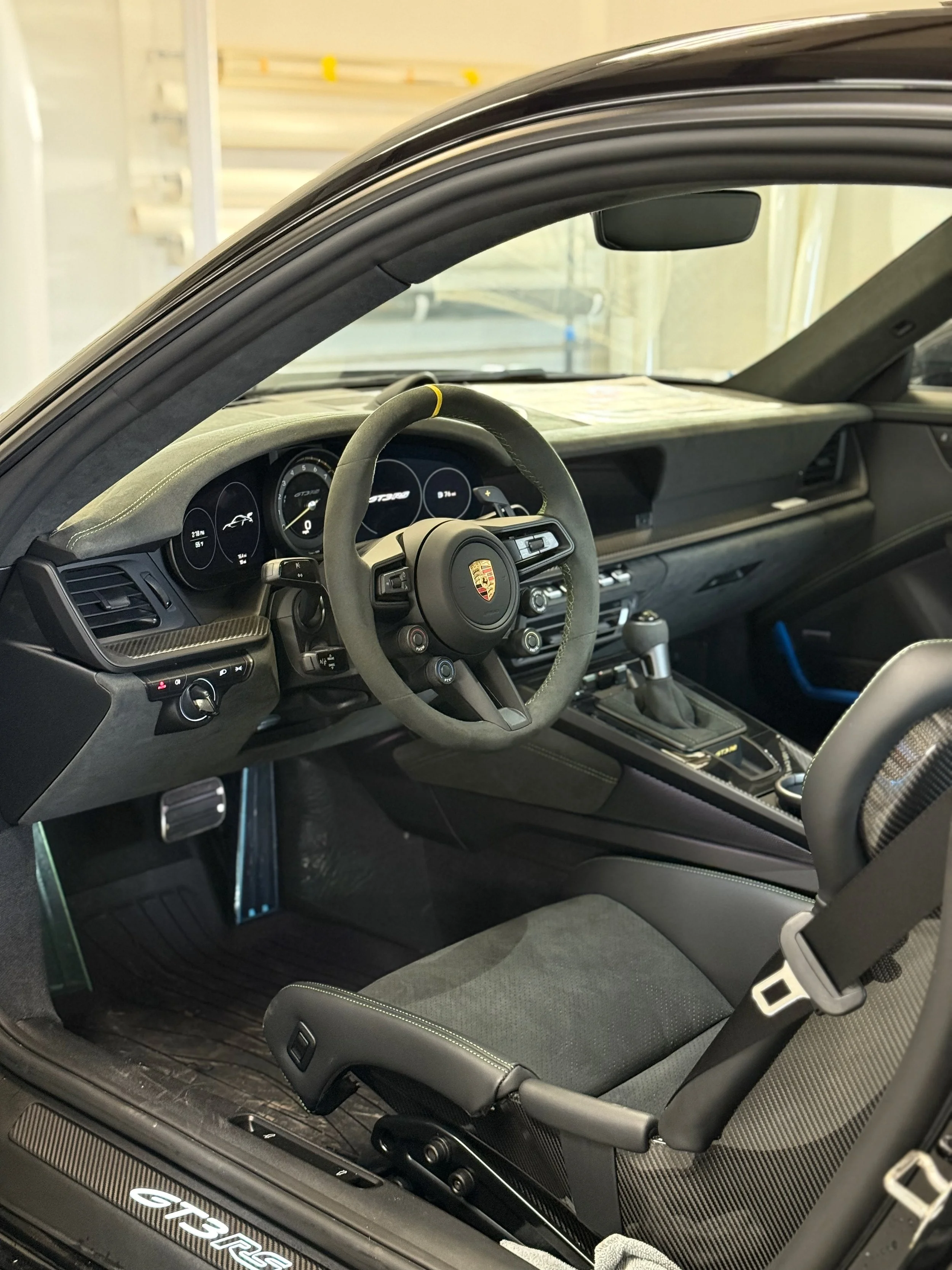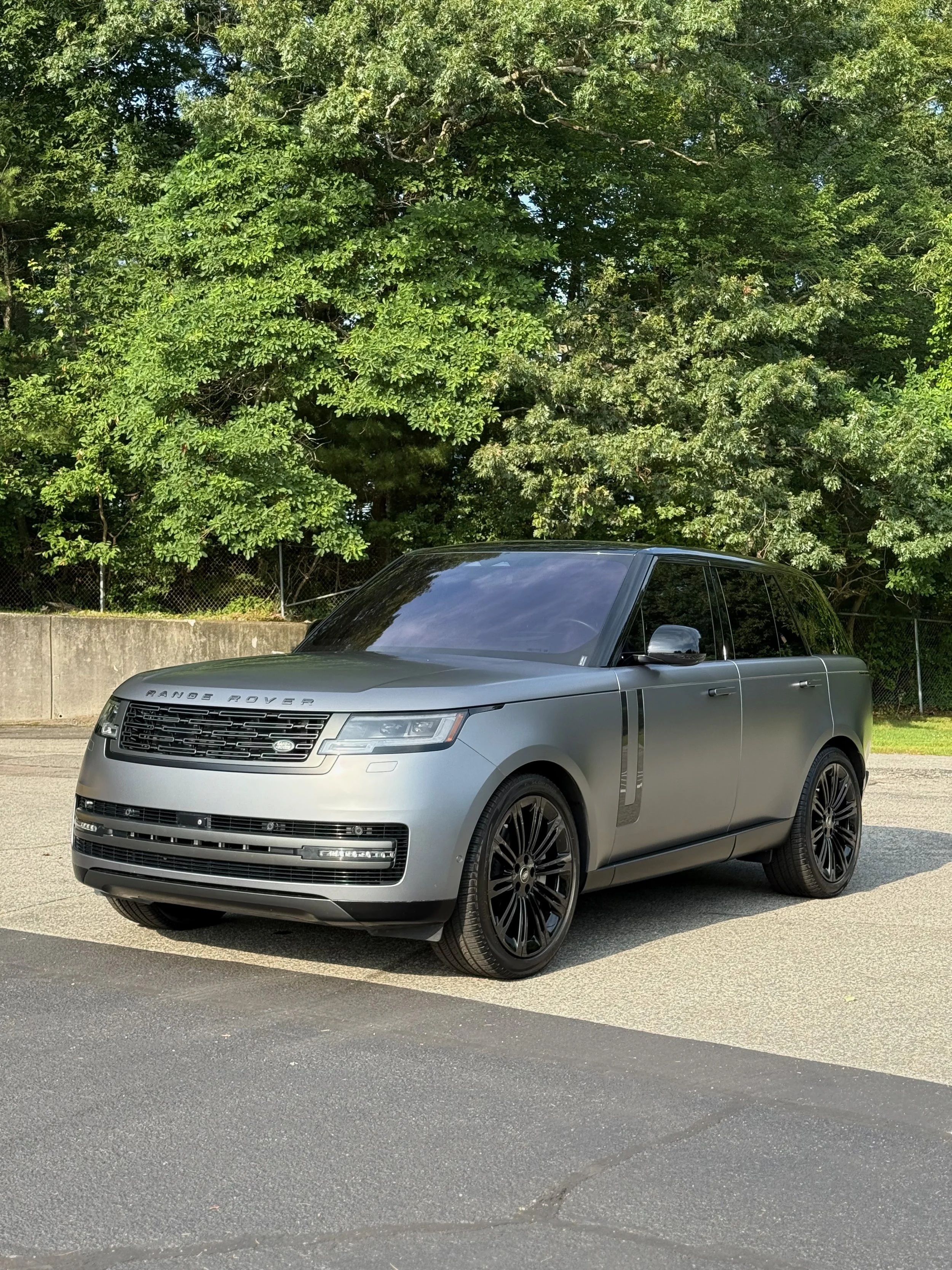 Black convertible car parked in a driveway, with a matte finish and open roof, surrounded by residential and commercial buildings.