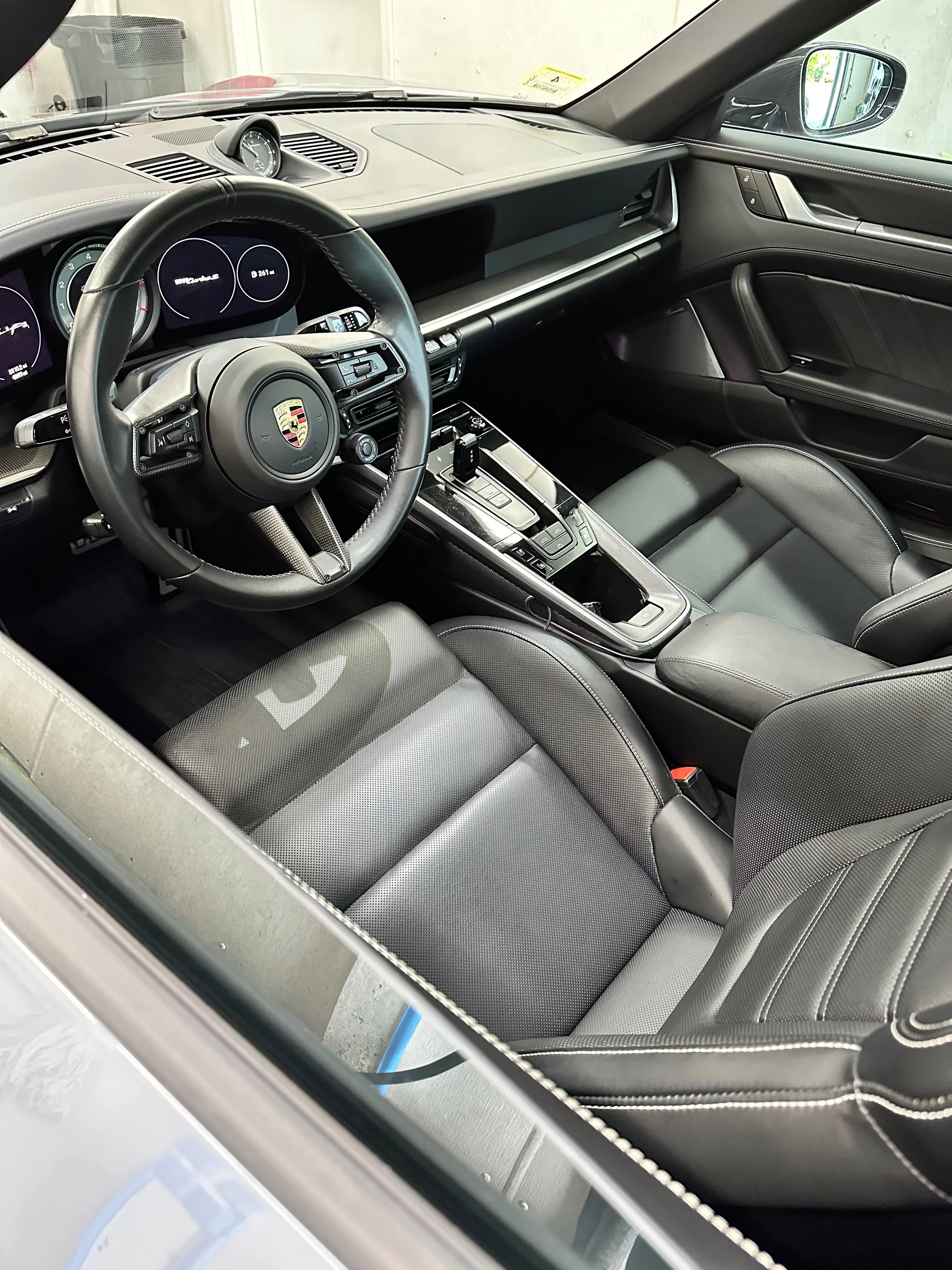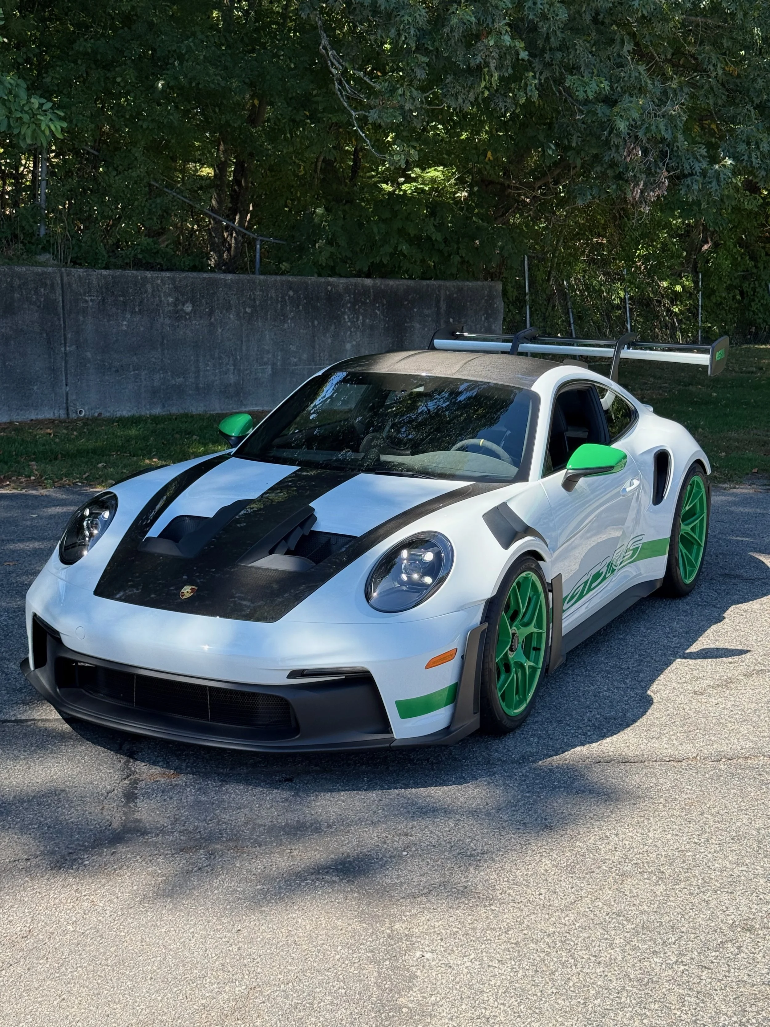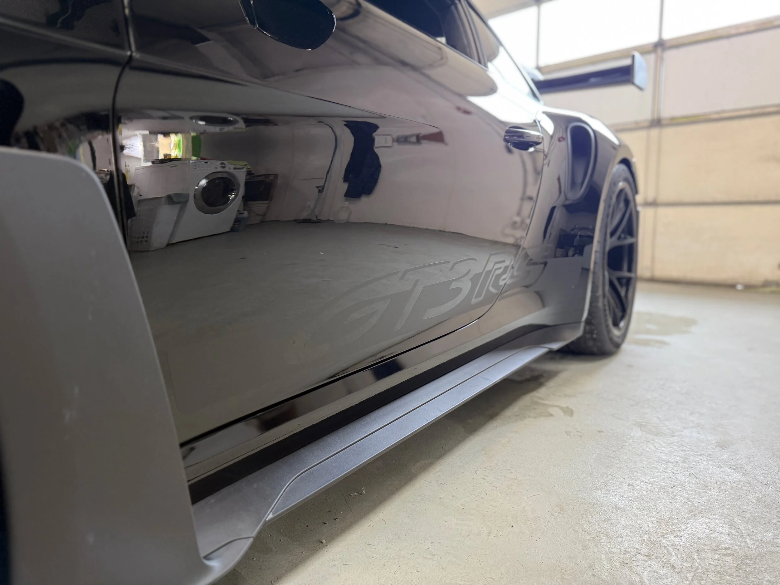 Car covered in soap suds, undergoing a wash in a driveway surrounded by autumn trees.