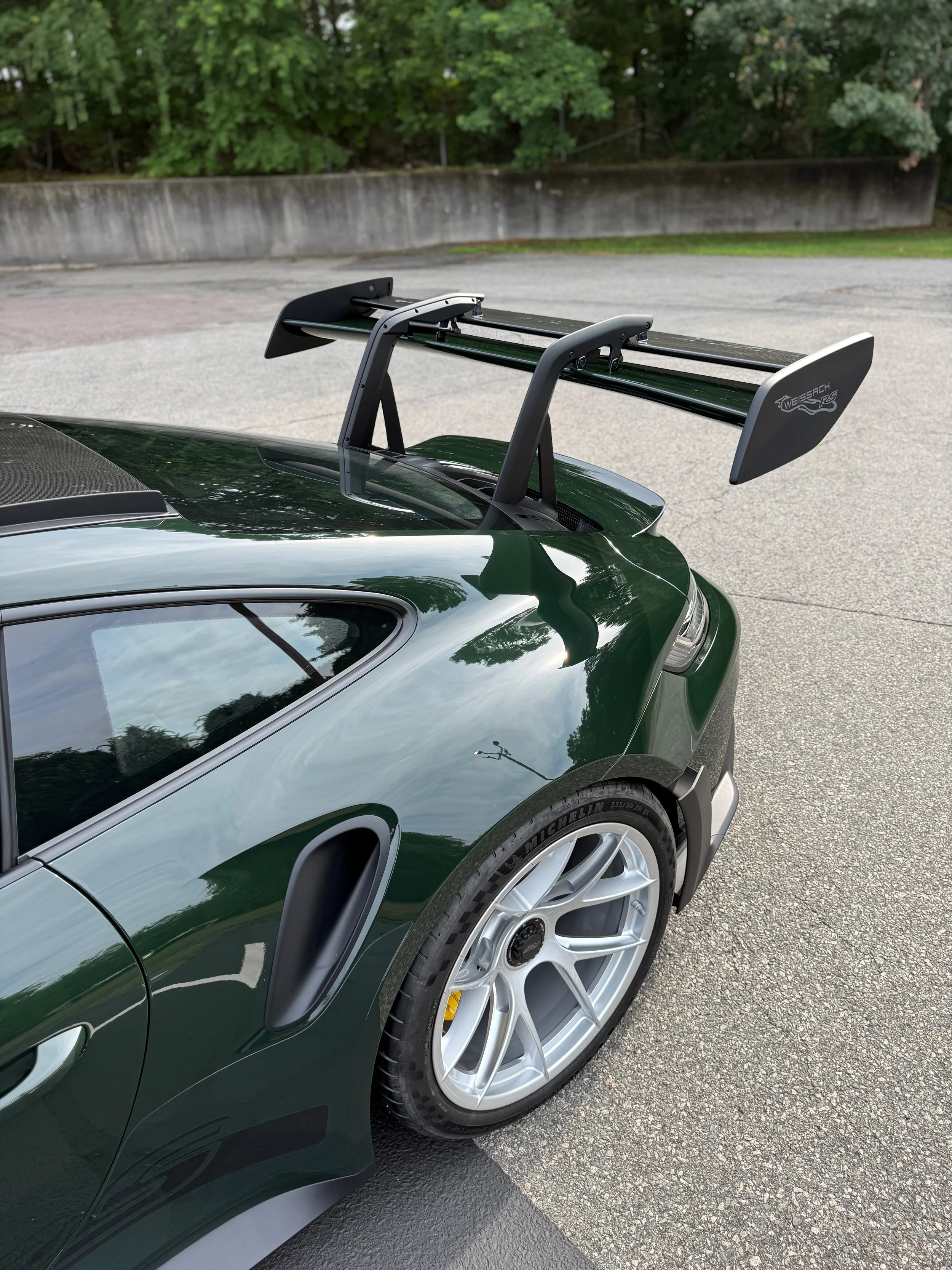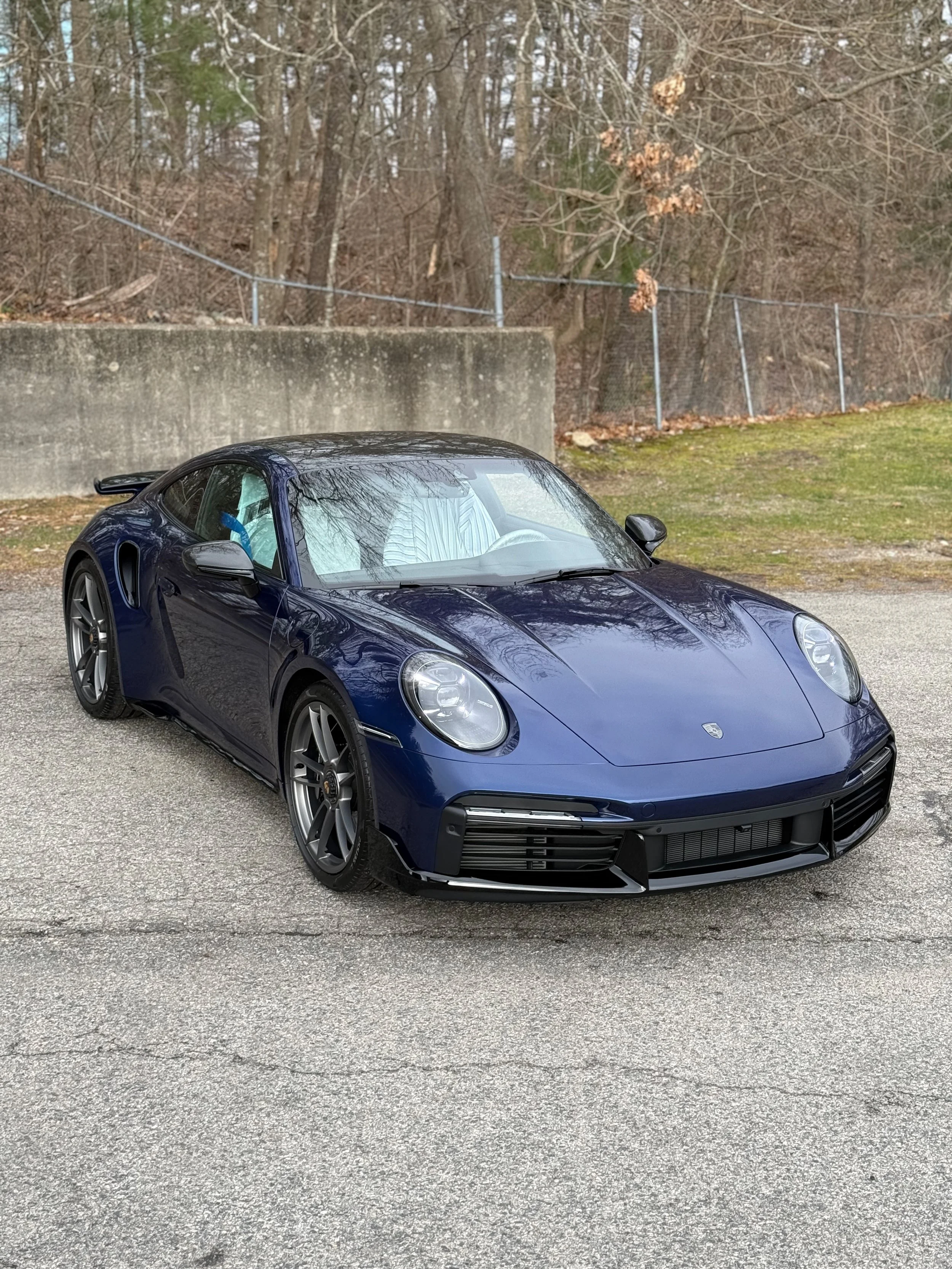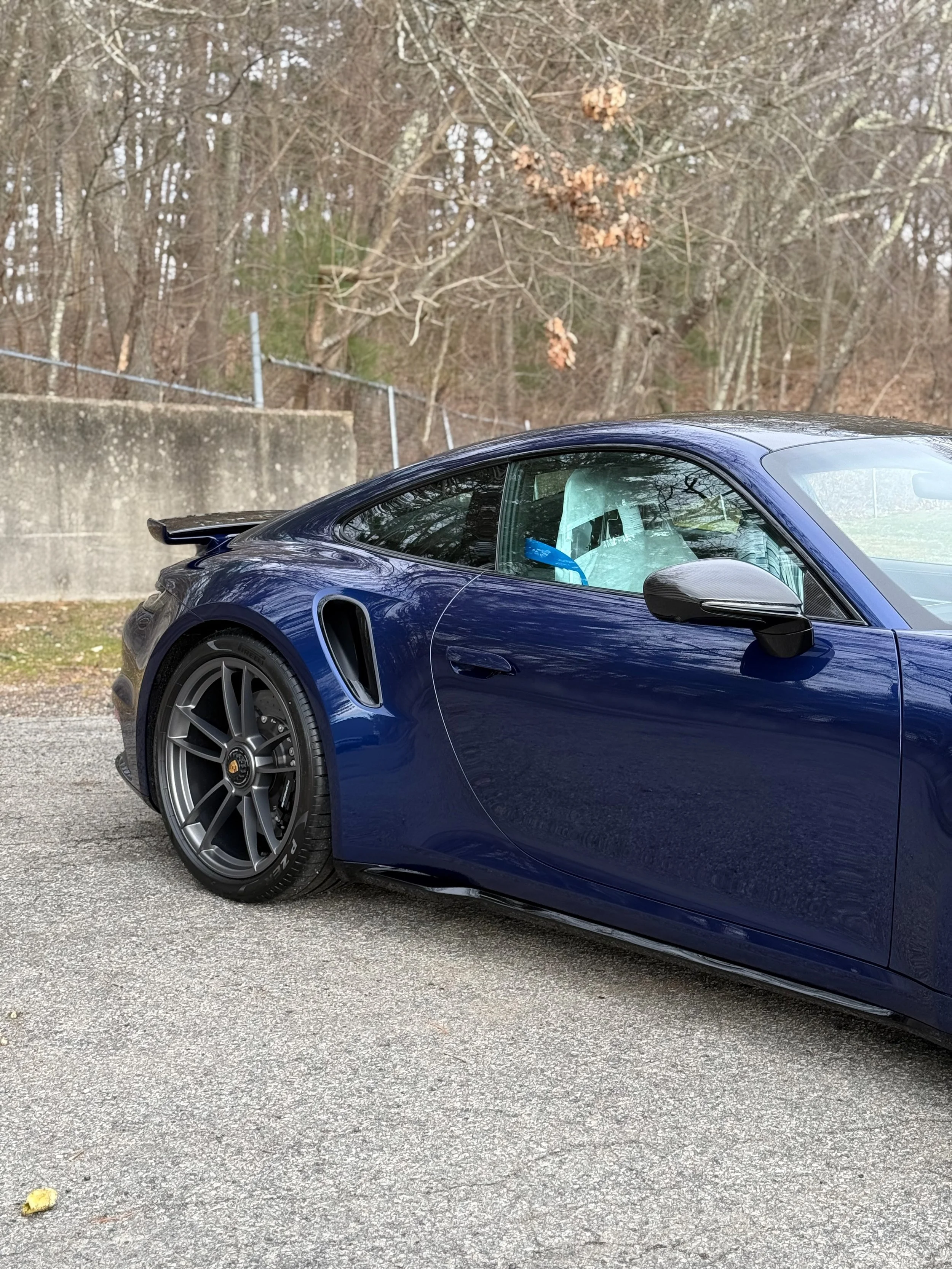 Car covered in soap suds, undergoing a wash in a driveway surrounded by autumn trees.