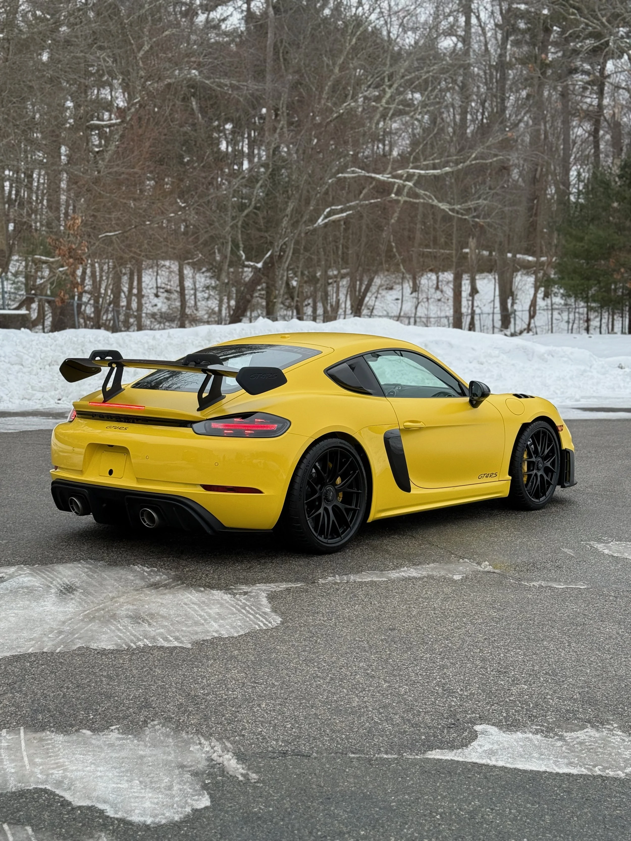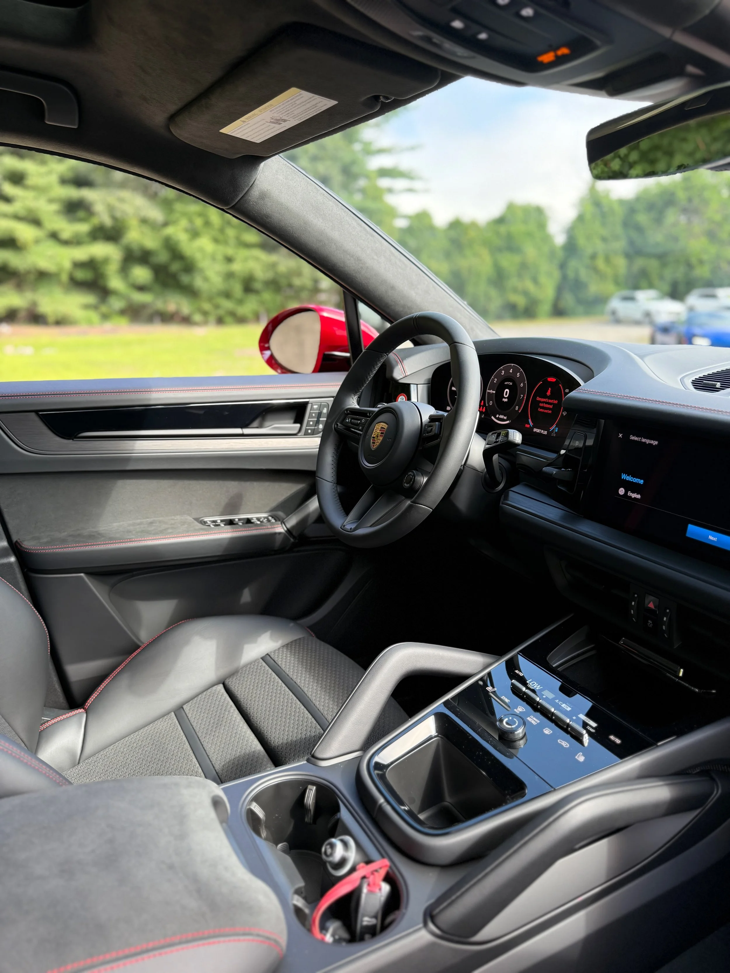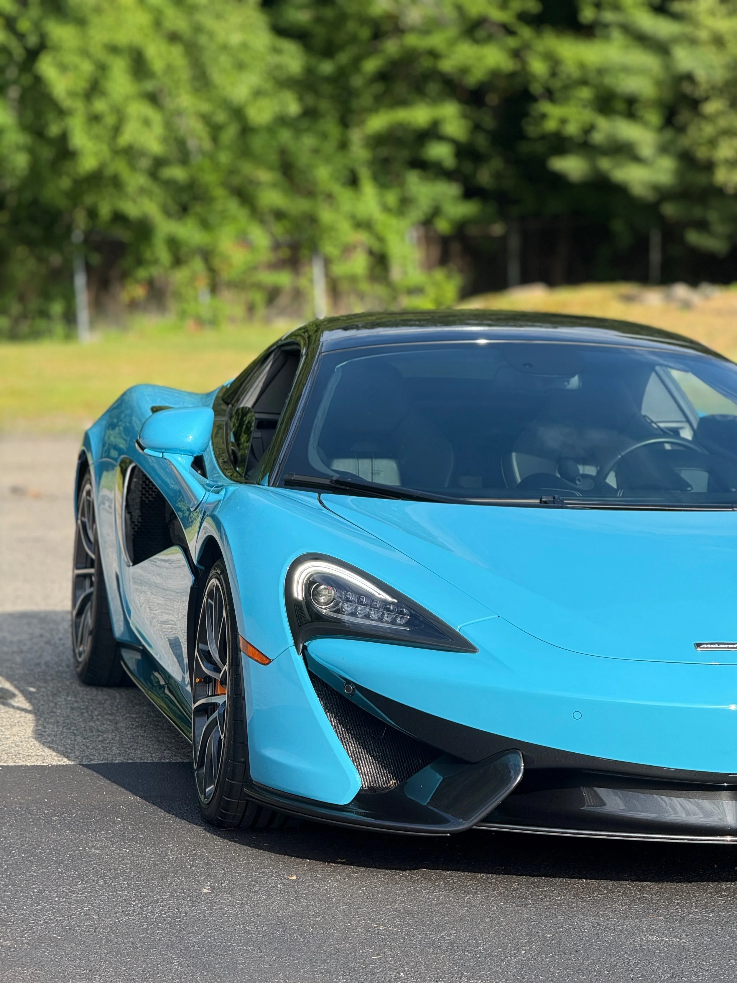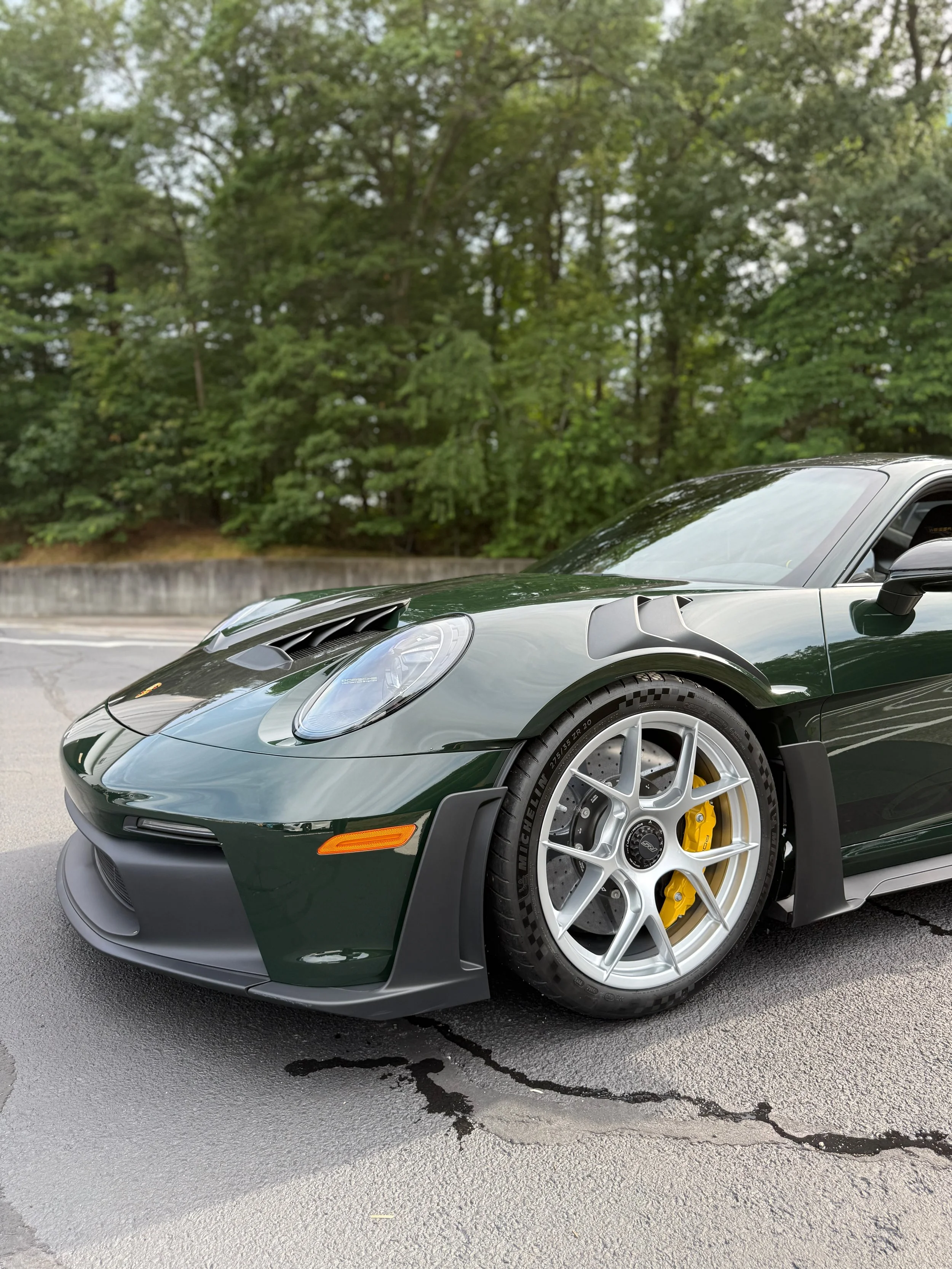 Black sedan parked on a road by a lake with trees, power lines, and a sunset in the background.