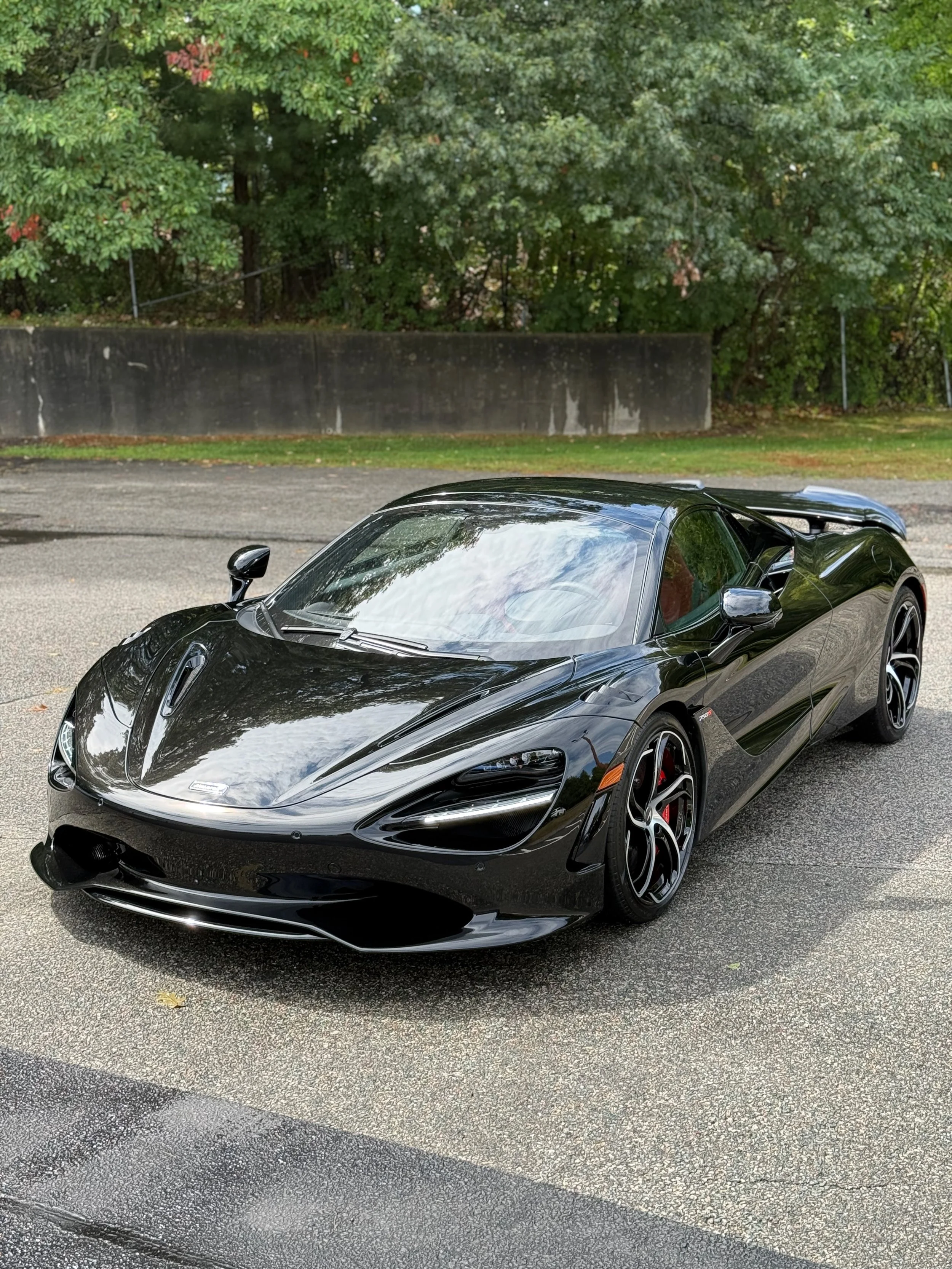Front view of a black Mercedes-Benz car parked on a driveway with trees and houses in the background.