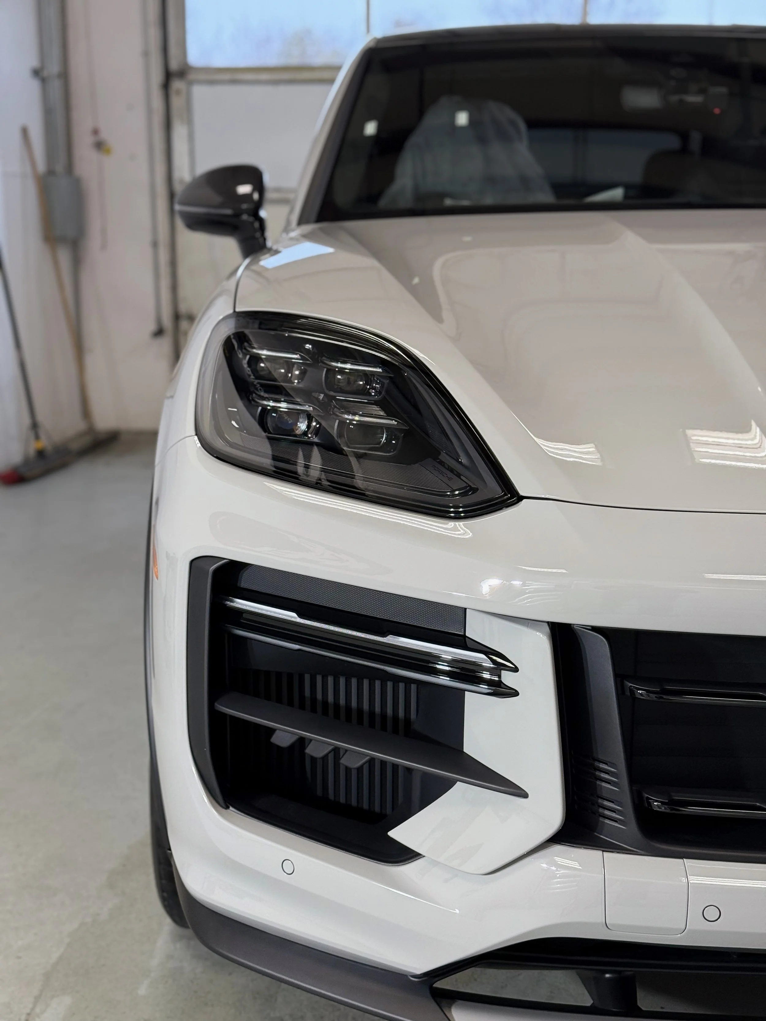 White Mercedes-Benz SUV parked in front of a gray house with a solar panel roof and a two-car garage.