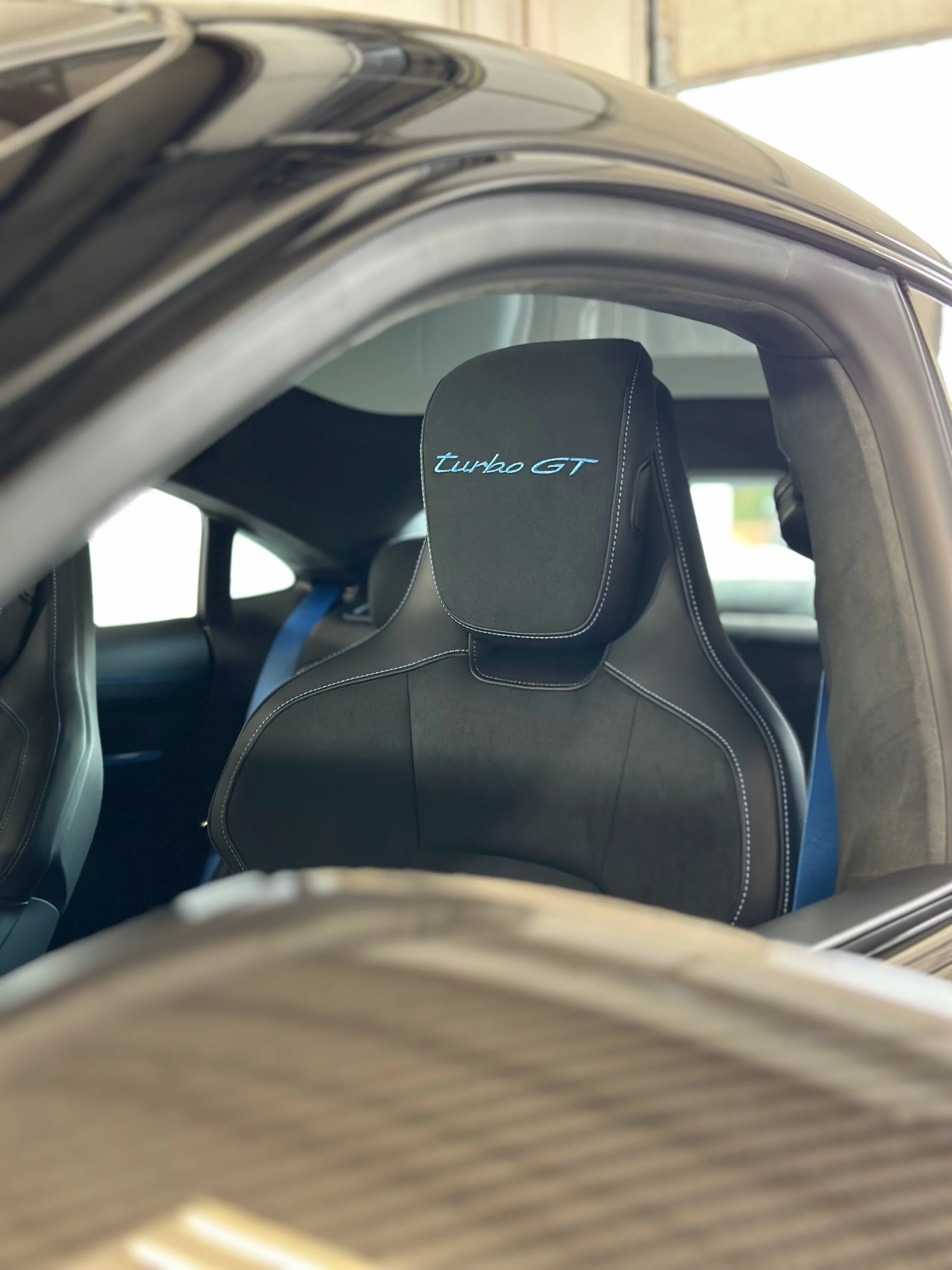 A green electric sedan parked indoors in a garage with white walls and a concrete floor.